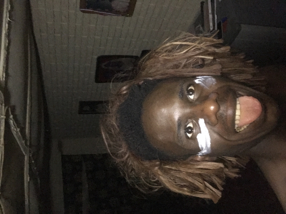 A dark-skinned person wears a wig with brown highlights and a black headband. White paint streaks adorn their face near the eyes and nose. The person sticks their tongue out. The background features a textured ceiling, framed pictures on the wall, a window with vertical slats, and a dark, undefined object. The lighting is dim, creating shadows and a somber mood.