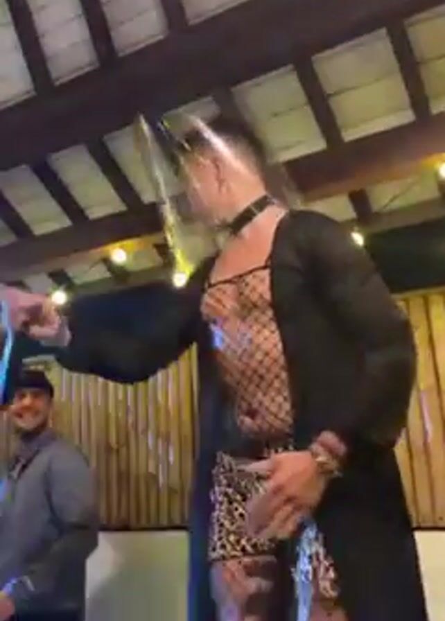 A slender man with short dark hair performs on a small stage in front of an audience. He's dressed in a black choker, fishnet top, leopard print shorts, black fishnet tights, and a black, floor-length sheer robe. The performer is holding a black microphone and is wearing a clear, plastic face shield on his head that resembles a crown. He's smiling and raising his hand as he sings. An indistinct person wearing a black tracksuit stands to his left. The stage is decorated with string lights and bamboo screens. A pitched wooden ceiling is above the stage.