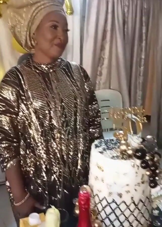 A woman in her 50s is standing next to a birthday cake. She is wearing a shiny gold and black dress and a gold head wrap. Behind her, there is a banner made of gold balloons that spell out "Happy Birthday." There is also a white chair and a curtain in the background. The cake is decorated with gold and black accents and has a "50" on top. There are bottles and glasses on the table in front of the cake. The woman is smiling and appears happy. The video is taken indoors, in what looks like a decorated party space.