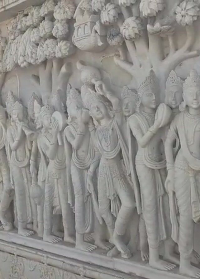 long, white stone wall covered in bas-relief carvings. The carvings depict a procession of people, mostly men, dressed in traditional Indian clothing. Some figures are carrying objects like flags, pots, and musical instruments. Above the figures, there are carved trees and decorative elements. The wall appears to be part of a temple or religious site, given the style of the art. The camera pans slightly across the length of the wall to show the full extent of the carvings.