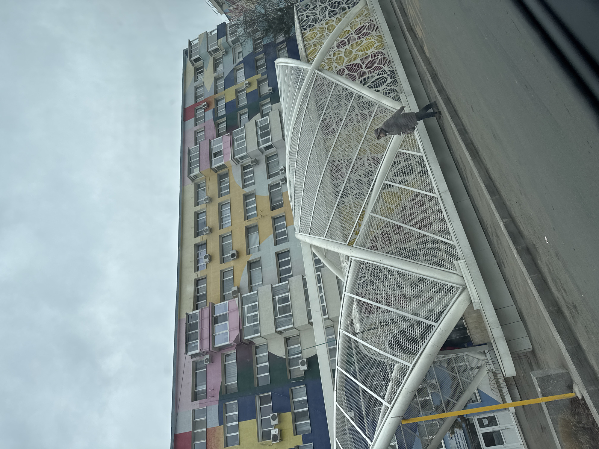 The image displays an urban street scene in Bucharest, Romania, specifically near the Pasajul Obor (Obor Overpass) and an adjacent building identified by a sign including "COLECTA-GABRIELA". The scene is captured under a uniform light grey, overcast sky. In the background, a multi-story residential building dominates, characterized by its brightly colored, geometrically patterned facade in hues of yellow, light blue, pink, red, dark blue, green, and grey. Numerous white-framed windows are visible across its surface, with multiple external air conditioning units affixed beneath them. The midground is occupied by a modern, elevated pedestrian overpass, appearing to be the Pasajul Obor, which extends diagonally across the frame. This structure consists of a light-colored metal framework supporting extensive white mesh panels. Sections of the overpass's side panels feature decorative, colorful stylized leaf patterns in shades of yellow, red, and green. A single adult individual, dressed in a dark padded winter coat and a dark hat, is observed walking on the elevated pedestrian path of the overpass, moving from the left side of the frame towards the right. The immediate foreground shows the edge of an asphalt road and a concrete curb. To the far left, a vertical yellow pole is present. Directly beneath the overpass structure, a building entrance with white double doors is visible, partially obscured, with signage above it that includes "ROMANIA" and "COLECTA-GABRIELA". Sparse, dry vegetation is visible near the yellow pole.