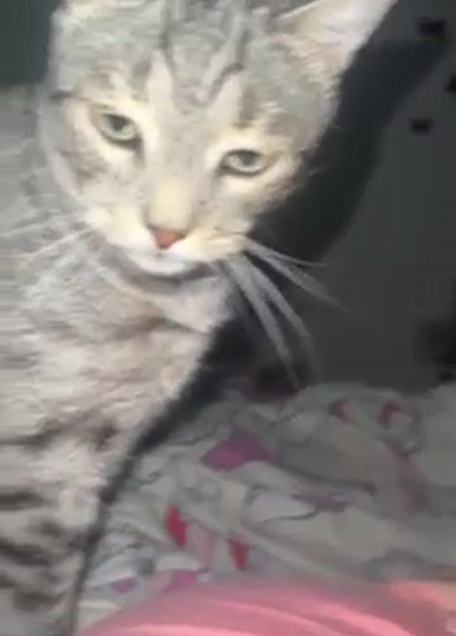 - "A gray tabby cat is seen close up, sniffing a human who is lying on a bed" by FM-YVkZG3, licensed under CC BY 4.0