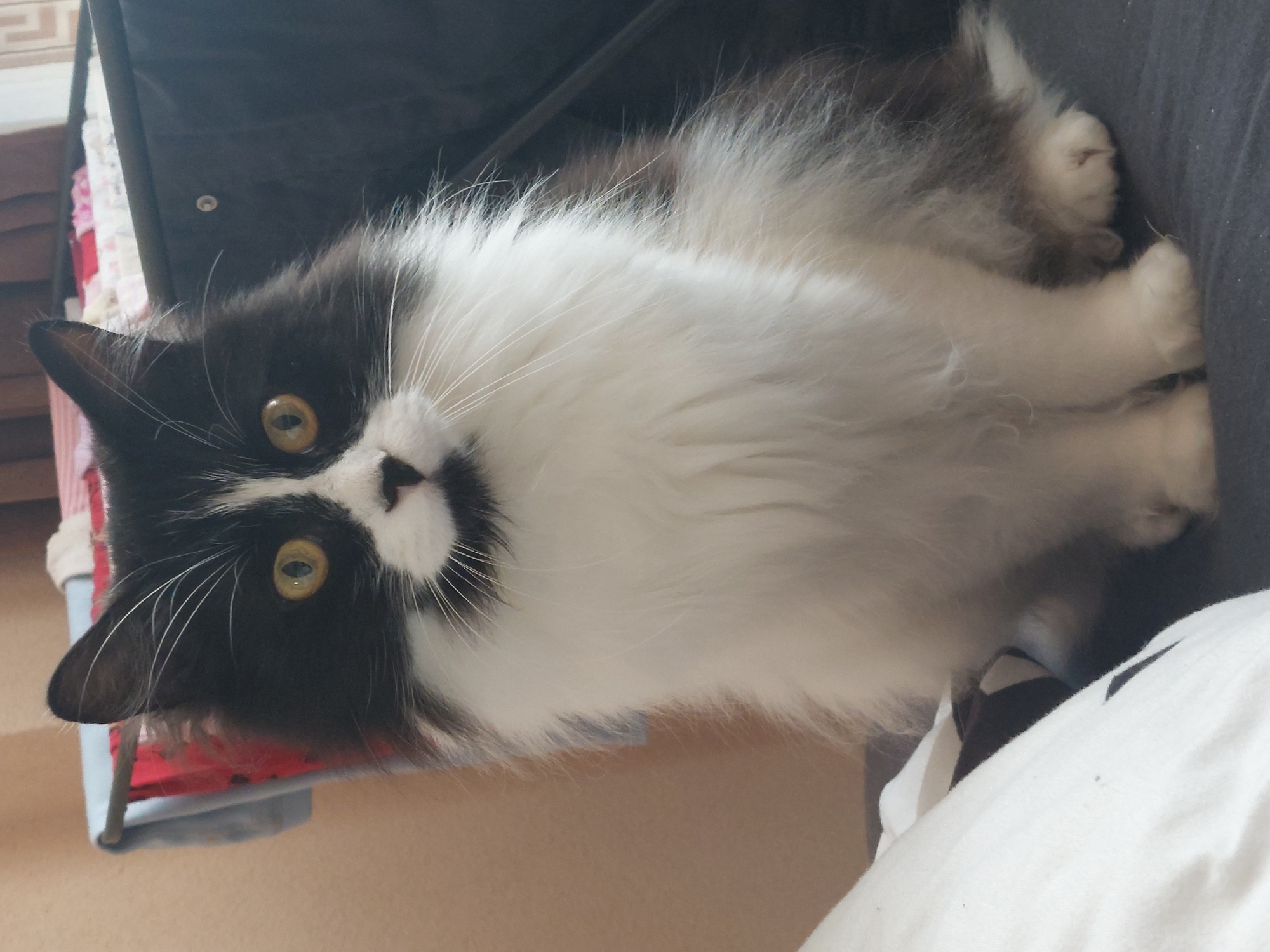A medium, slightly-rotated close-up shot depicts a black and white cat lying on a surface, possibly a bed or sofa. The cat has long white fur around its neck and chest, with black fur on its head and back. It features yellow eyes and a black nose. Due to lack of further details, it's impossible to determine the precise location in Plovdiv, Bulgaria.