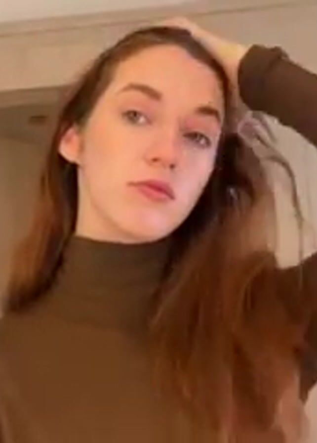 person with long, reddish-brown hair and light blue eyes standing indoors. The person is wearing a brown turtleneck sweater. They are facing the camera and use their right hand to adjust their hair, pushing it back from their forehead. The background shows a light-colored wall, a closed door with dark hardware, and a blue wall with a light fixture. The person then looks at the camera and smiles slightly.