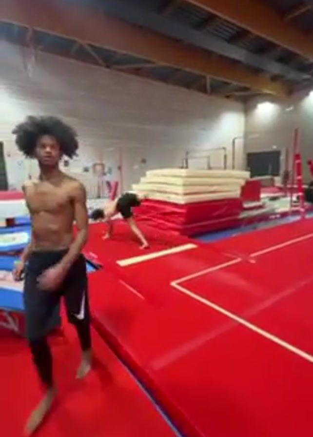 two shirtless young men in what appears to be a gymnastics training facility. The man in the foreground is walking on a red surface, wearing black Nike pants. He has dark curly hair. The second man is further away, and briefly performs a flip onto a stacked mat. The room has high ceilings with exposed beams, and is filled with gymnastics equipment.