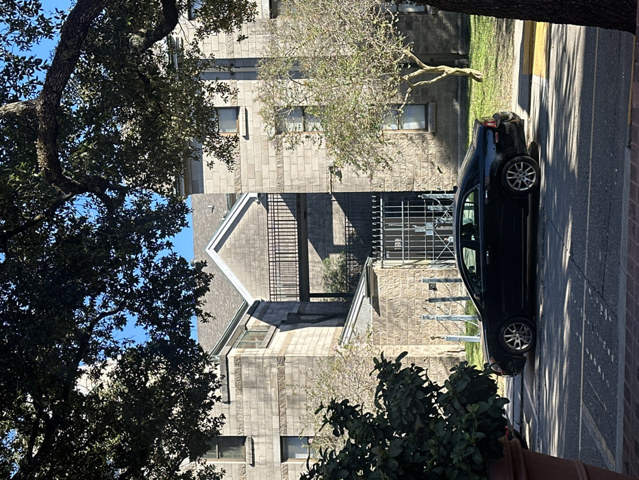 This image depicts the Federal Building / U.S. Court of Appeals for the Fifth Circuit, located at 600 Camp Street, New Orleans, Louisiana, United States. The scene is captured on a clear, sunny day, with strong, direct sunlight creating prominent shadows. The central subjects are two sections of a multi-story building constructed from large, light grey, rough-hewn stone blocks, featuring multiple rectangular windows with dark frames. These building sections are connected by an elevated, open-air pedestrian bridge with dark metal railings, spanning above a ground-level entrance. This entrance is secured by a tall, dark metal gate, and in front of it, several light-colored posts linked by chains form a low barrier. A dark-colored, four-door sedan, consistent with a black Chevrolet Malibu, is parked facing right on the asphalt street in the foreground, adjacent to a yellow curb. The top and left portions of the image are framed by the dense, dark green foliage and trunks of mature trees, likely live oaks, which cast dappled shadows across the pavement and the vehicle. A large, dark green potted plant is visible in the lower-left foreground. Green grass covers a lawn area directly in front of the building. No individuals are visible in the scene.