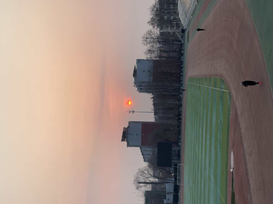 The image depicts an outdoor sports stadium in the city of Zhongtun, China, at either sunrise or sunset. The sky is dominated by a hazy orange and pink gradient, with a low-lying, intensely red-orange sun visible directly above the distant urban skyline, positioned between two multi-story buildings. In the foreground, a reddish-brown running track curves from the lower left to the mid-right. One individual, dressed in dark clothing with pink athletic shoes and a light-colored cap, is visible walking or jogging on the innermost lane of the track, near the lower center of the frame. A second, smaller figure in dark attire is discernible further down the track on the right side. Adjacent to the running track is a green artificial turf field marked with numerous parallel white lines, indicating lane divisions or markings. A white soccer goal is positioned on the far left side of the field. To the left of the field, a large, dark rectangular screen, likely a scoreboard or display, is present. The background features several multi-story urban buildings. A prominent structure to the left exhibits a grey upper facade and a red lower section, with visible rooftop equipment. Another similar grey building is located further to the right. Between these structures, a tall utility pole with a light fixture or antenna is visible. Numerous leafless trees are interspersed among the buildings and stadium periphery, suggesting a cold season. On the far right, sections of stadium seating, partially covered in a white substance (likely snow or frost), are visible.