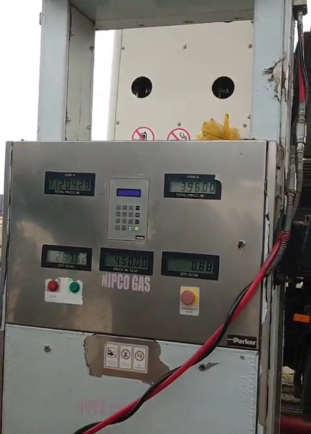 NIPCO Gas fuel dispenser with digital displays showing total price and quantity for two arms