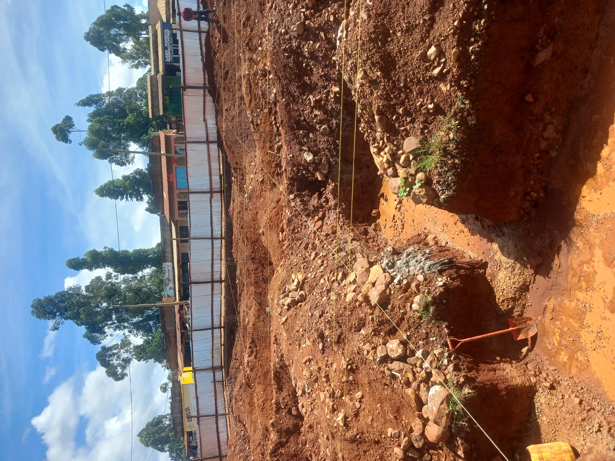 The image displays an active construction site in a commercial area of Unknown, Unknown, under a clear blue sky with scattered white clouds. The foreground and midground are dominated by reddish-brown excavated earth, featuring multiple trenches and pits, some partially filled with muddy water. An orange shovel is positioned upright in a muddy trench on the left, near a pile of small gravel. A yellow plastic jerrycan is visible in the lower-left corner. Yellow string lines are taut across the excavated terrain, indicating marking or leveling. Several rebar cages for concrete foundations protrude from the earth in various pits. A corrugated metal sheet fence separates the construction zone from a row of single-story commercial buildings in the background. These buildings have diverse facades; visible signs include "ALIMED NYAMAYA PHARMACY CHEMIST" on a white building, and "UTILILISHI CYBER & SALOON" on an adjacent yellowish structure. Two individuals are present: one man, wearing a reddish-brown shirt and dark trousers, stands on the right side of the construction site facing away from the camera, near the fence. A second person, in a light-colored top, is partially visible behind the fence, in front of a red-painted building. Tall green trees, consistent with eucalyptus, rise behind the buildings, and black utility wires stretch horizontally across the upper portion of the frame.