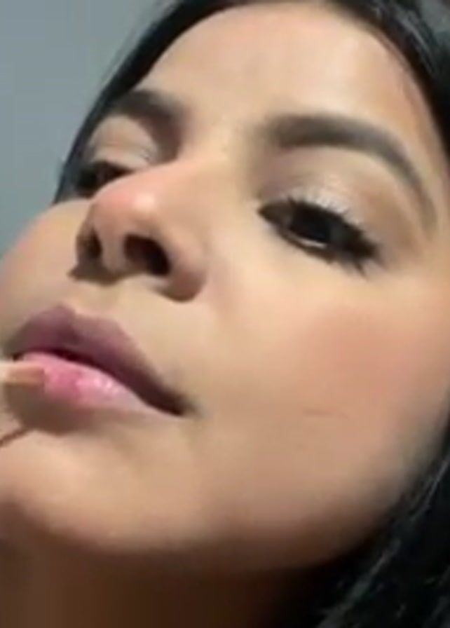 A young woman with dark hair is applying lip gloss with a wand applicator. The camera is close to her face, slightly angled upwards. Her room is visible in the background, including a closet with hanging clothes, some items on a shelf, and a blue wall.