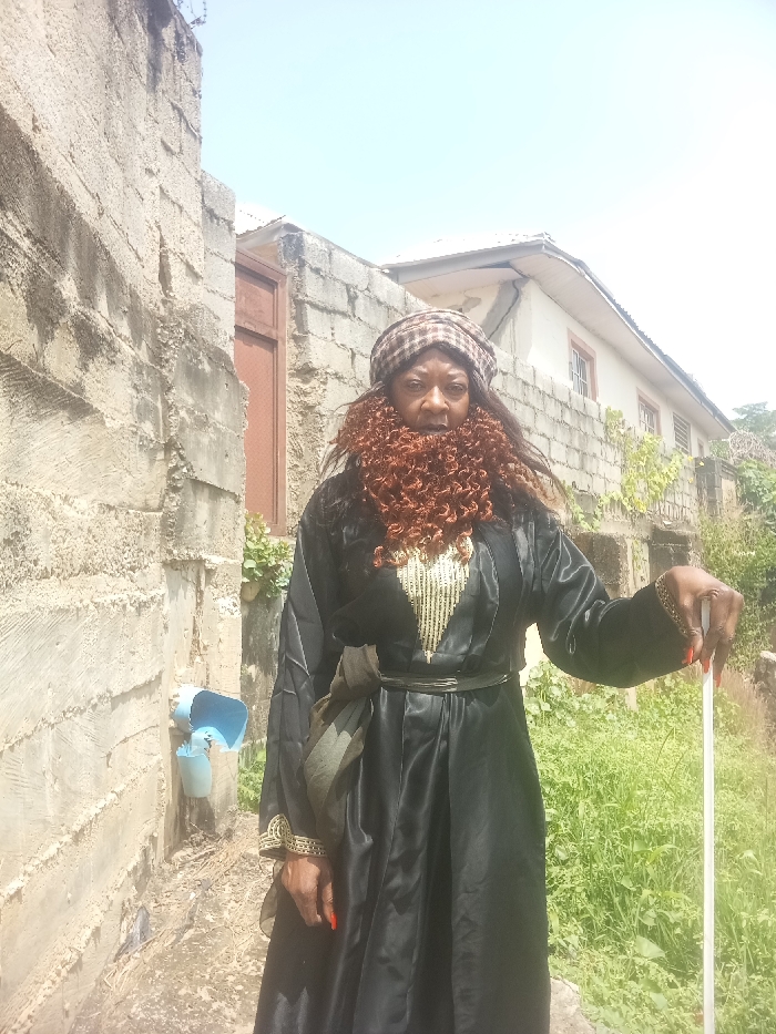 An outdoor, eye-level photograph captures a single adult individual in what appears to be a residential area of Abuja, Nigeria, under bright daylight. The individual, appearing female with dark skin, stands centrally, facing the camera with a neutral expression. They are dressed in a long, dark (likely black), flowing garment with long sleeves and gold-colored vertical embroidery on the chest. A dark sash is tied around the waist. A brown and beige checkered turban covers the head, and a prominent, curly, reddish-brown wig or faux beard frames the face and neck. The individual's right hand holds a white cane; the fingernails are painted red. A gold-colored, patterned bracelet is worn on the left wrist. The background on the left features a rough, unpainted concrete block wall with a broken light-blue plastic pipe attached at waist height. Behind the subject and slightly to the right, another similar concrete block wall is visible, featuring a reddish-brown wooden door. Further to the right and in the background is a two-story building with a light-colored facade, multiple windows, and a pitched roof. The ground in the right foreground is covered with overgrown green grass and weeds.