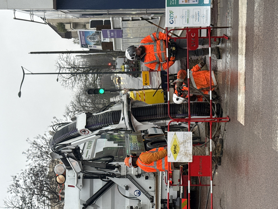 A utility work scene is observed on a wet asphalt street in Fontenay-aux-Roses, France, under an overcast sky