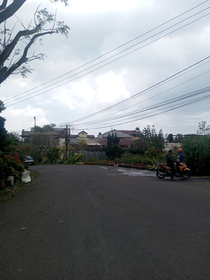 The scene depicts a paved road in Kalchini, India, under an overcast sky. The road, a dark asphalt surface, curves slightly to the left. On the left foreground, dense green foliage with some reddish-pink flowers partially obscures a dark-colored car, with a white plastic object or bag on the ground nearby. A large tree branch extends into the upper left. On the right, two individuals are present on a yellow/orange scooter. The driver wears a dark jacket, and the passenger wears a blue jacket and an orange helmet; they are stationary at the side of the road, near a collection of potted plants. Multiple utility poles and numerous overhead power lines crisscross the upper half of the image. In the background, a residential area features various buildings with different roof types, including tiles and corrugated metal, interspersed with abundant vegetation and trees. Some rooftops show visible water tanks.