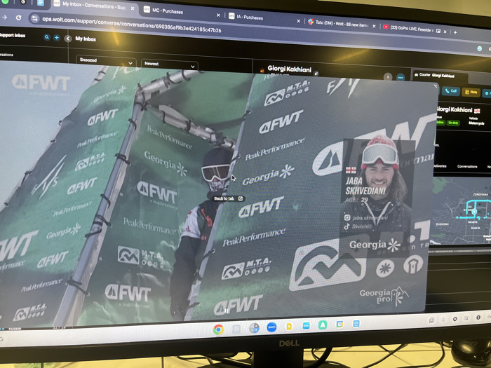 The image displays a computer monitor positioned on a dark desk surface, showing an active web browser session. Multiple tabs are open, including "My Inbox - Conversations - Sup..." (from ops.wolt.com), "MC - Purchases," "IA - Purchases," "Tato (DM) - Wolt - BB new item...", and "(33) GoPro LIVE: Freeride P..." (a YouTube tab). The primary visible content is within the Wolt support interface. The main display area features a video feed or image of a person dressed in ski/snowboard gear, wearing goggles, standing next to a large green banner structure. The banner is covered with repeated logos including "AFWT," "Georgia," "Peak Performance," "M.T.A.," and "Georgia pro." An opaque white overlay is centered on this display, presenting a smiling individual identified as "JABA SKHVEDIANI, AGE: 29," alongside a small Georgian flag and social media handles "jaba.skhvediani" and "Skvichia" with a TikTok logo. To the right of the main display, within the same Wolt interface, a map of a city is partially visible, featuring discernible district names such as "ZOROVINA," "DIGHOMI," "AVCHALA," "Gldani," "Temka," "Didube," "Nadira," "Isani," "Samgori," "Varketili," "Saburtalo," "Vake," and "Krtsanisi." These are districts of Tbilisi, Georgia, indicating the map's location. Above this map, text identifies "Courier: Giorgi Kakhiani" with a "Motorcycle" vehicle type, listed as "On duty." The bottom of the monitor shows the Windows taskbar with icons for applications including Chrome and Edge. The desk surface directly beneath the monitor is dark, with visible wires.