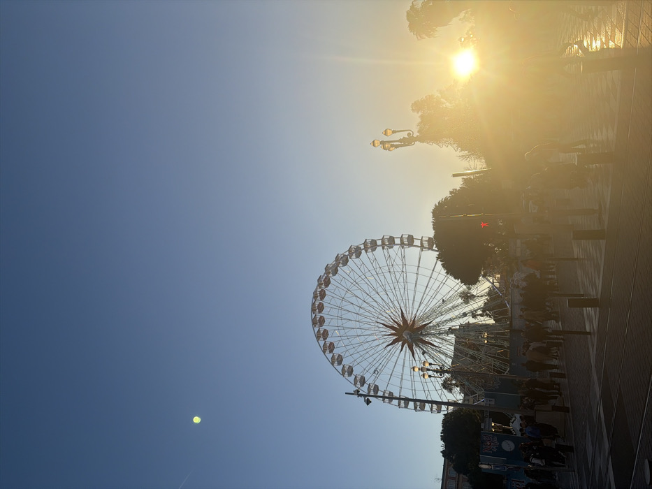 A Ferris wheel dominates the lower right, framed by trees and streetlights, with people faintly visible in the background. The sun shines brightly in the upper right corner, casting a golden hue over the scene. A clear blue sky fills the upper left, with a solitary dot near the bottom. The overall composition gives a sense of a busy, sunny day at an amusement park or waterfront location.