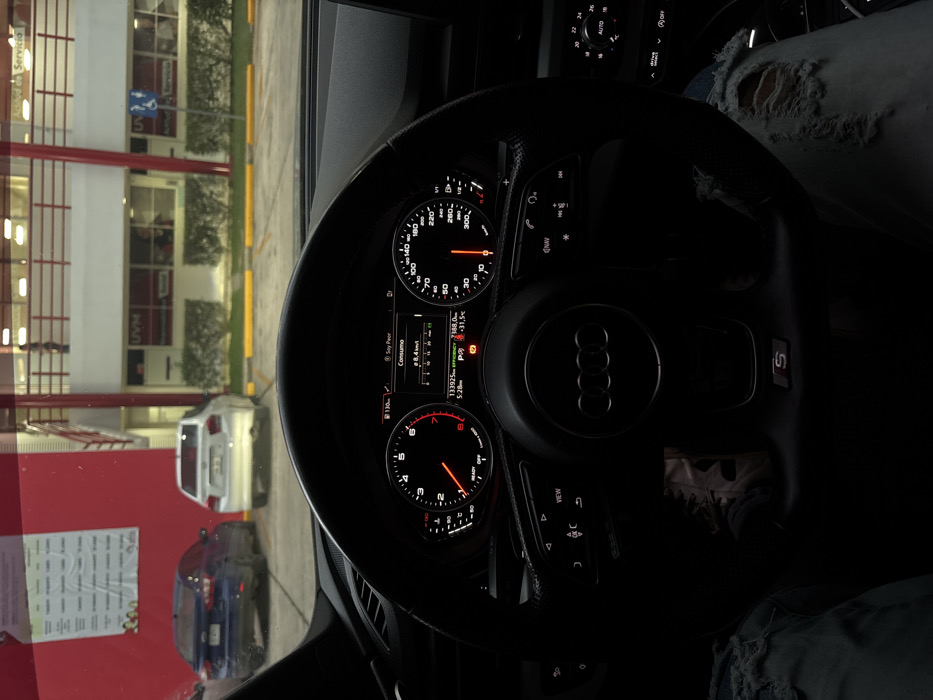 - "The image displays a first-person view from the driver's seat of an Audi vehicle, specifically identifiable by the steering wheel's logo and "S" badge, looking out onto a parking lot and a building" by FM-6Fibs2, licensed under CC BY 4.0