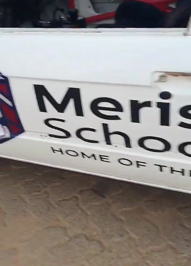 side of a white race car. The words "Derishaw School" and "Home of the Boy Child" are written in black letters along the side. A red roll cage is visible inside the car. The car has no engine and a lot of wiring is exposed. There is a logo on the side of the car in red, blue, and white. The car is parked on a cobblestone surface.
