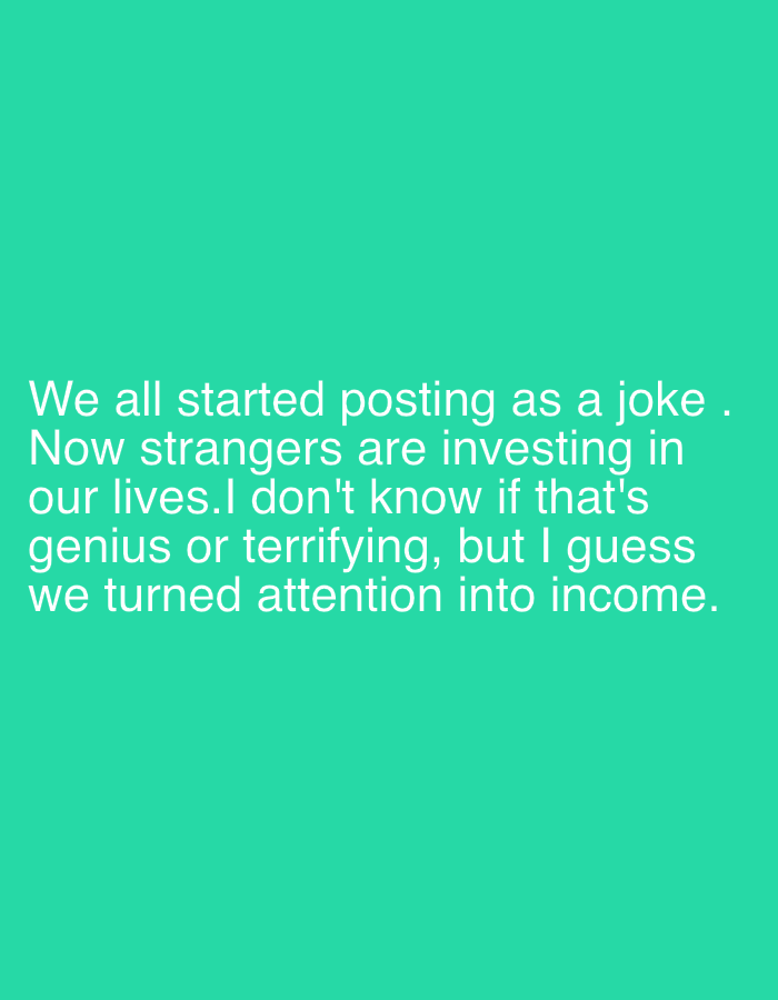 text on a green background. The text reads: "We all started posting as a joke. Now strangers are investing in our lives. I don't know if that's genius or terrifying, but I guess we turned attention into income." The image does not contain any information about Plovdiv, Bulgaria.