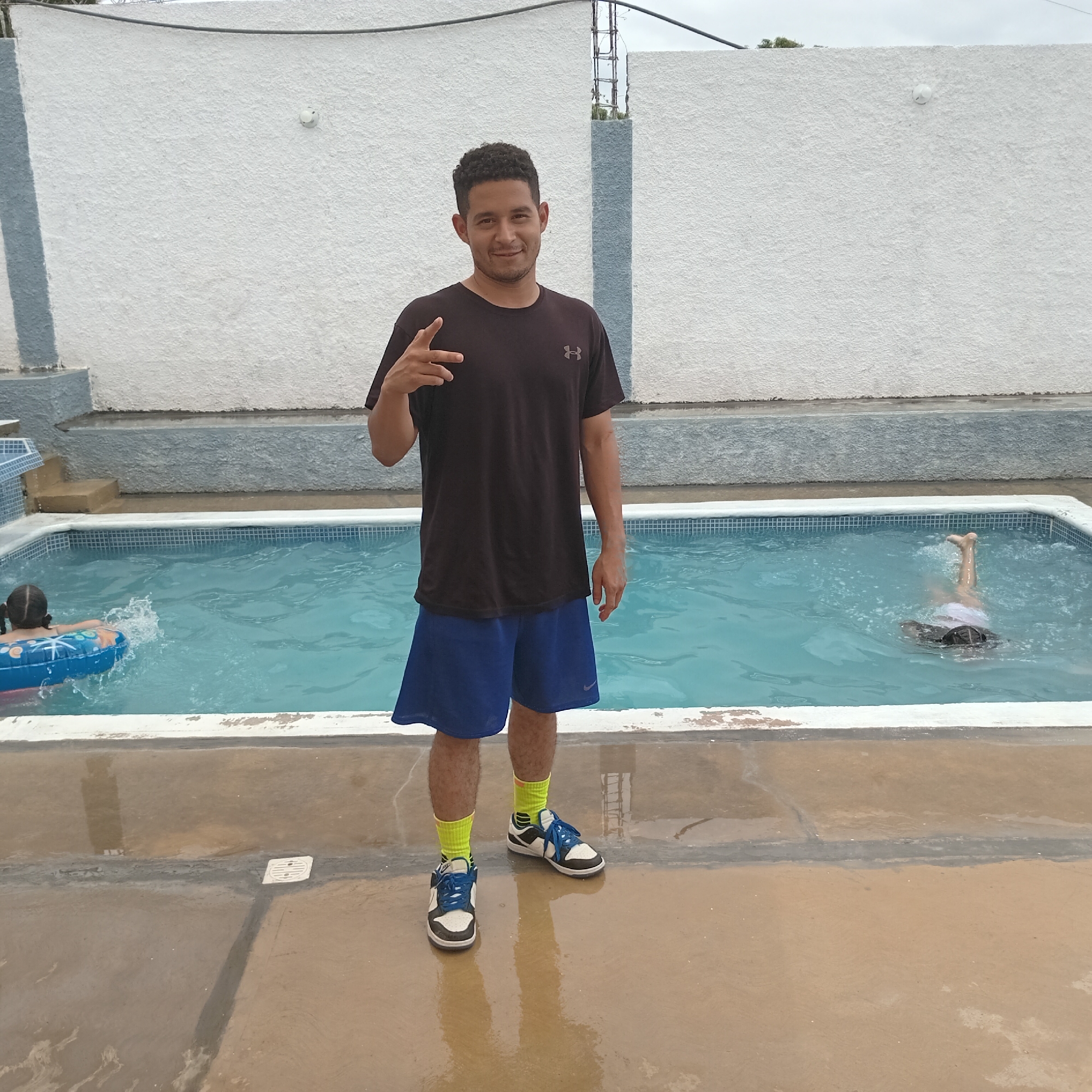 A man stands in front of a swimming pool in El Eneal, Venezuela. He has short, dark curly hair, is wearing a black t-shirt, blue shorts, and blue/white tennis shoes with yellow socks. He is gesturing with his right hand, forming a V with his index and middle finger. In the pool, two individuals are visible: one is in the left part of the pool sitting in a blue inflatable ring and the other is swimming underwater. The area surrounding the pool appears wet. A white wall with a gray base runs along the back of the scene.