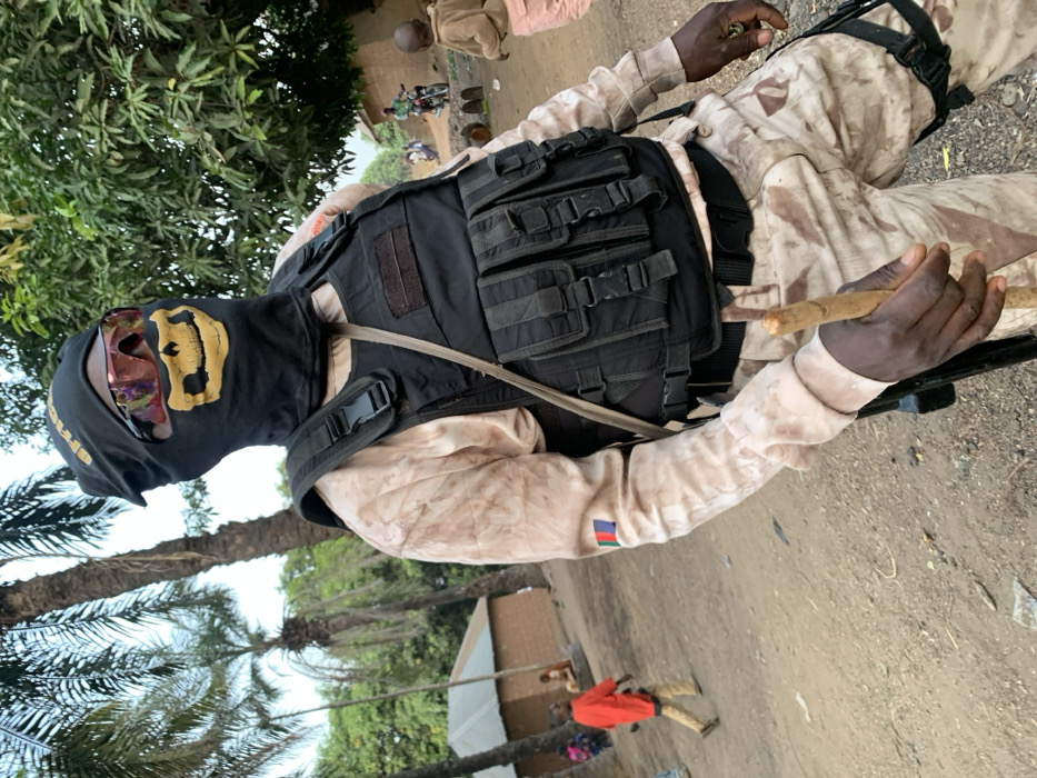 An individual in tactical attire stands prominently on an unpaved road in the city of Tabu, Nigeria