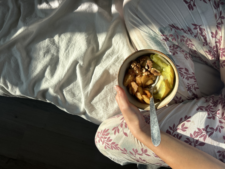 An overhead, first-person perspective captures an individual's lower torso and left arm, situated in Vanves, France. The person wears light-colored trousers adorned with a maroon leaf pattern. A left hand supports a ceramic bowl containing a meal composed of sliced golden kiwi, whole walnuts, and caramelized apple pieces; a metallic spoon rests within the bowl. To the right, a crumpled, light-colored fabric, consistent with a bedsheet or duvet, occupies the space. To the left, a dark wooden floor is partially visible. Direct sunlight illuminates sections of the scene, creating distinct shadows across the floor and fabric.