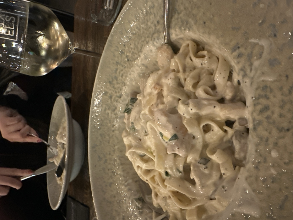 The image captures an indoor dining scene at a restaurant, identified by a wine glass bearing the "ELS" logo, consistent with SENS ELS restaurant located at bul. "Knyaz Boris I" 116 in Varna, Bulgaria. The foreground features a close-up, slightly overhead view of a light-colored, rustic-style bowl filled with fettuccine or tagliatelle pasta. The pasta is coated in a creamy white sauce, containing pieces of protein (likely chicken or shrimp), finely chopped green herbs, and black pepper flakes. A silver fork is partially visible, resting in the pasta on the right side of the bowl. In the mid-ground, to the upper left, a person's hands are visible holding a silver fork and knife, actively eating from a second, identical bowl containing the same pasta dish. The person wears dark clothing, and their fingernails are painted with light pink polish. To the upper right, a stemmed wine glass holds a pale yellow liquid, indicative of white wine, and is etched with the "ELS" logo. A second, clear drinking glass is partially visible beyond the wine glass. All items rest on a dark, polished wooden table surface. The lighting is dim, suggesting an evening ambiance, with warm reflections visible on the wine and table.