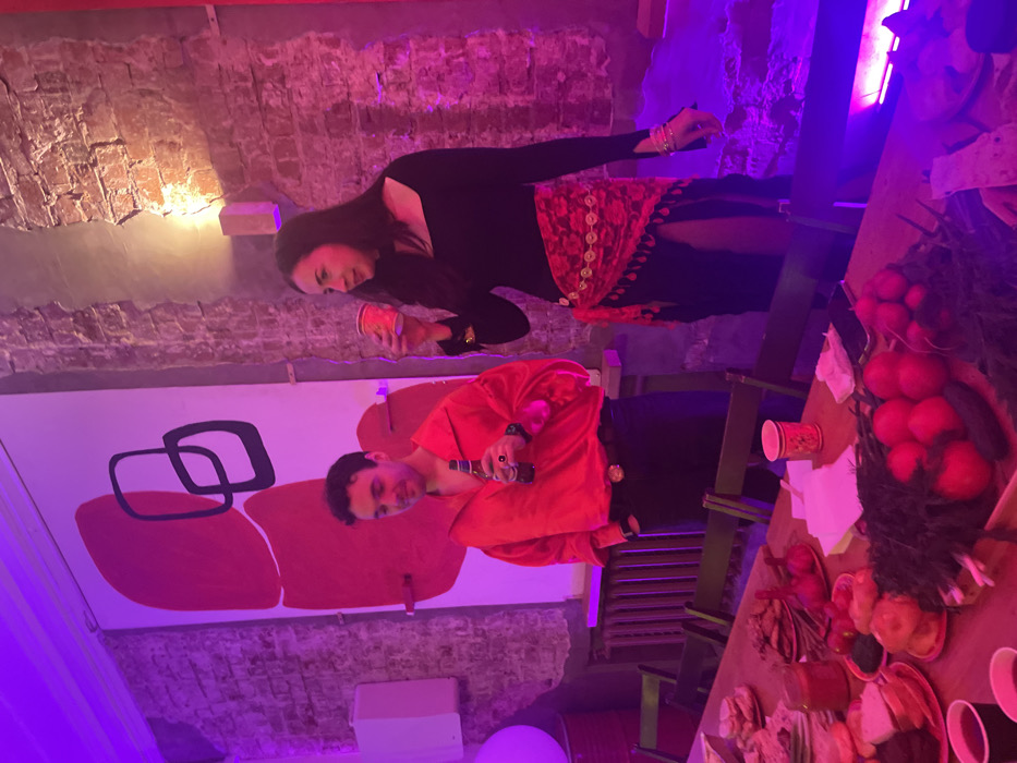 The image depicts an indoor social gathering, likely a party or dinner, with two individuals standing beside a long, dark wooden table laden with food and drinks. The exact location within Укромновское сельское поселение, Ukraine, cannot be determined from the provided visual information. The scene is illuminated by strong artificial purple/magenta lighting, casting a vibrant hue across the entire space. The walls feature exposed brickwork, partially plastered or painted, with areas of exposed red brick texture visible. A large, vertical white canvas displaying abstract red and black shapes is mounted on the left wall. A wall-mounted sconce with a yellowish light is visible on the right brick wall, its light heavily influenced by the purple ambient lighting. **People:** 1. **Male Subject (left):** A young adult male with dark hair stands behind a chair at the table. He is wearing a bright red, voluminous long-sleeved shirt, unbuttoned at the collar, over dark trousers secured by a gold-colored belt buckle. He holds a dark-colored bottle, possibly beer, in his right hand. A ring is visible on his left hand and a watch on his left wrist. His gaze is directed downwards and to his left, and he exhibits a faint smile. 2. **Female Subject (right):** An adult female with long dark hair stands slightly behind and to the right of the male subject, next to the table. She is wearing a long-sleeved black top with a square neckline and a long black skirt or dress with a high slit on the right leg. A red fabric sash or scarf with a floral pattern and fringe is draped around her hips, secured by a metallic, chain-like belt adorned with circular elements. Multiple bracelets are visible on her left wrist, and a ring is on her right hand. She holds a red disposable cup to her mouth with her right hand, looking forward and slightly to her left. Her mouth is slightly open, suggesting she may be speaking or drinking. **Objects and Environment:** * **Table:** A long, rustic wooden table occupies the foreground and midground. * **Food:** The table is covered with various food items, including plates of baked goods or pastries, sliced bread, small red items (possibly tomatoes or small fruits), and abundant green herbs (e.g., dill, rosemary). A bowl or basket containing whole red tomatoes and at least one green cucumber is also present. * **Drinks:** Several red disposable cups, matching the one held by the female, are on the table, along with at least one dark-colored mug or cup. * **Other Table Items:** A stack of white napkins and a partially visible smartphone are on the table. * **Furniture:** Dark-colored wooden chairs with slatted backs are positioned around the table. A dark radiator is visible beneath the large artwork on the left wall. * **Miscellaneous:** A large, white spherical object, possibly a balloon or decorative light fixture, is partially visible on the far left.