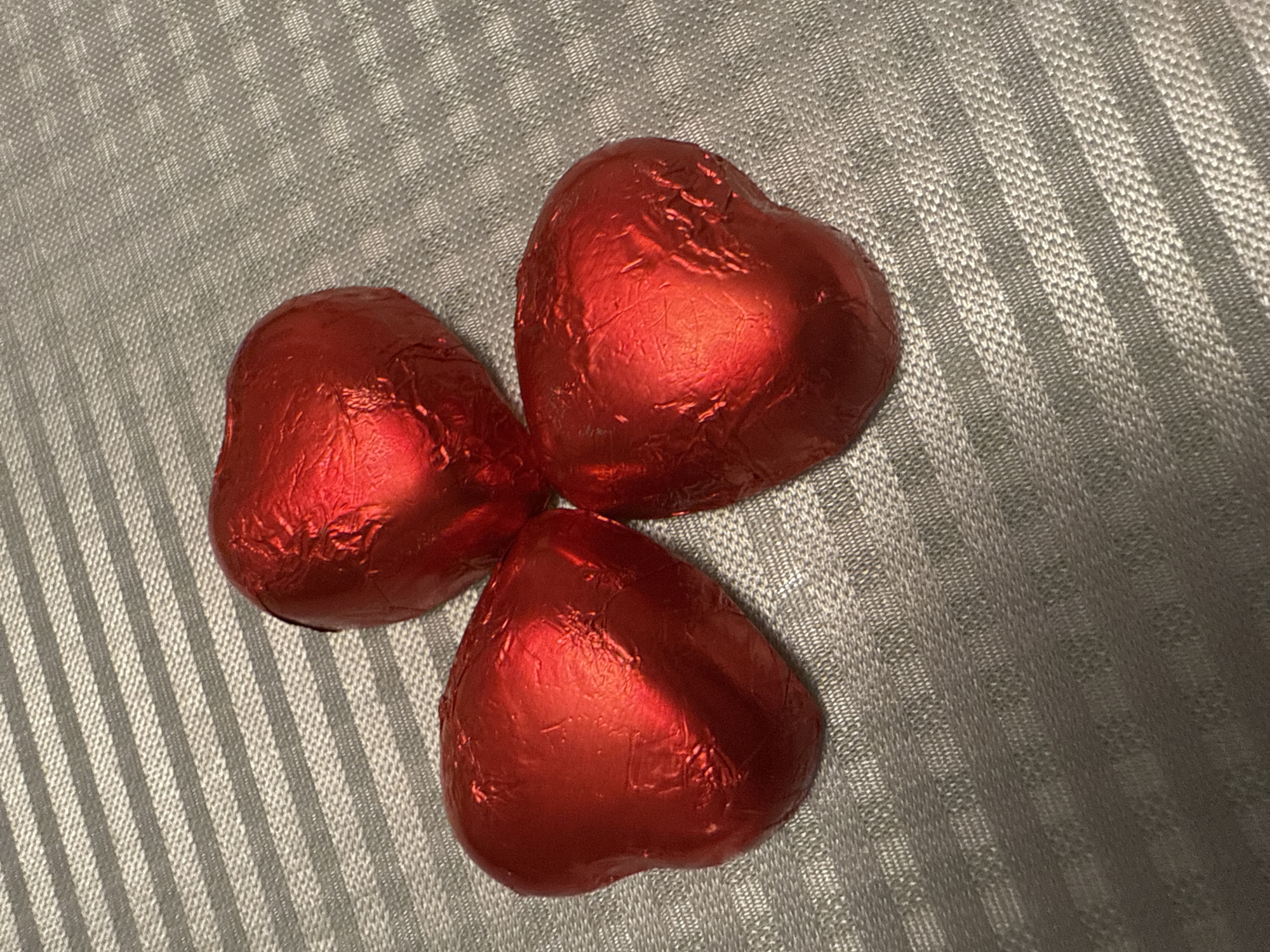 Three red foil-wrapped heart-shaped chocolates are arranged in a triangular formation on a textured gray surface