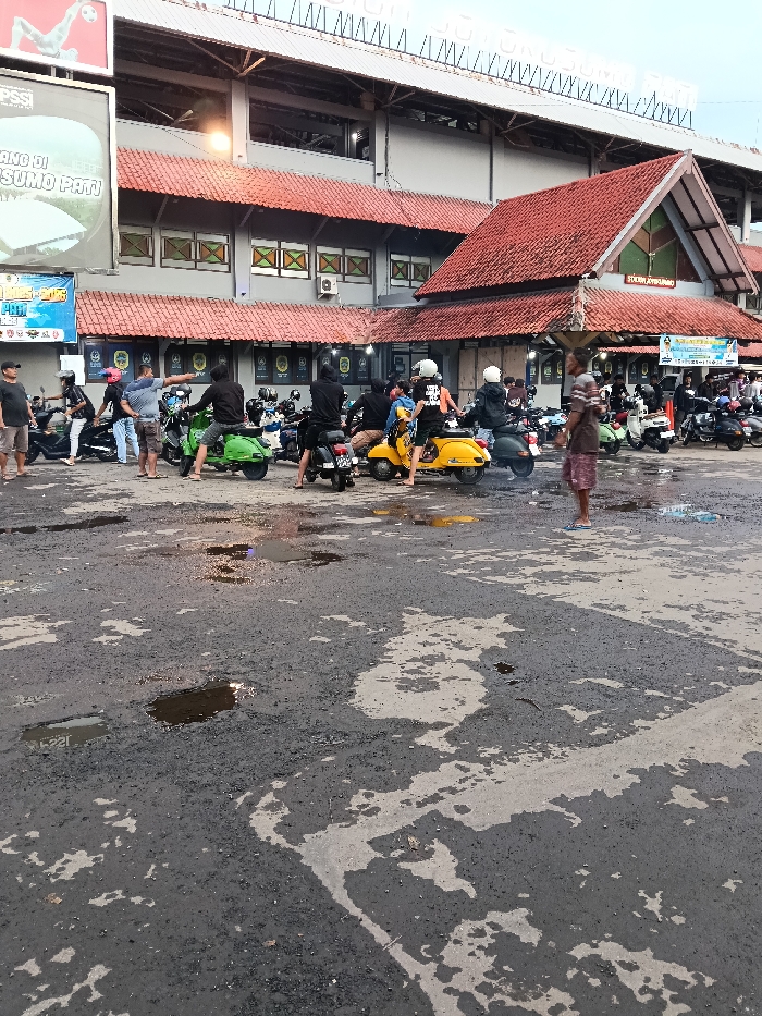 The image displays an outdoor scene at the Stadion Joyokusumo in Margorejo, Indonesia. Approximately 15 to 20 individuals, primarily male and casually dressed, are gathered in a wet, asphalt parking area. Numerous motorbikes are present, predominantly classic Vespa scooters of various colors including green, yellow, and black. The ground shows extensive dampness and several puddles, indicating recent rainfall. In the background, the multi-story stadium building features a grey facade, multiple windows, and a distinctive red-tiled roof. A smaller, gabled entrance structure with a similar red roof is attached, prominently displaying "STADION JOYOKUSUMO." On the far left, a tall billboard featuring a football player graphic and text "STADION JOYOKUSUMO PATI" is visible. Individuals are engaged in various actions: some stand near or sit on their motorbikes, a group in the center-left appears to be conversing, with one man pointing, while another individual in a striped shirt and sarong stands alone on the right, observing the scene. The lighting suggests daylight conditions.