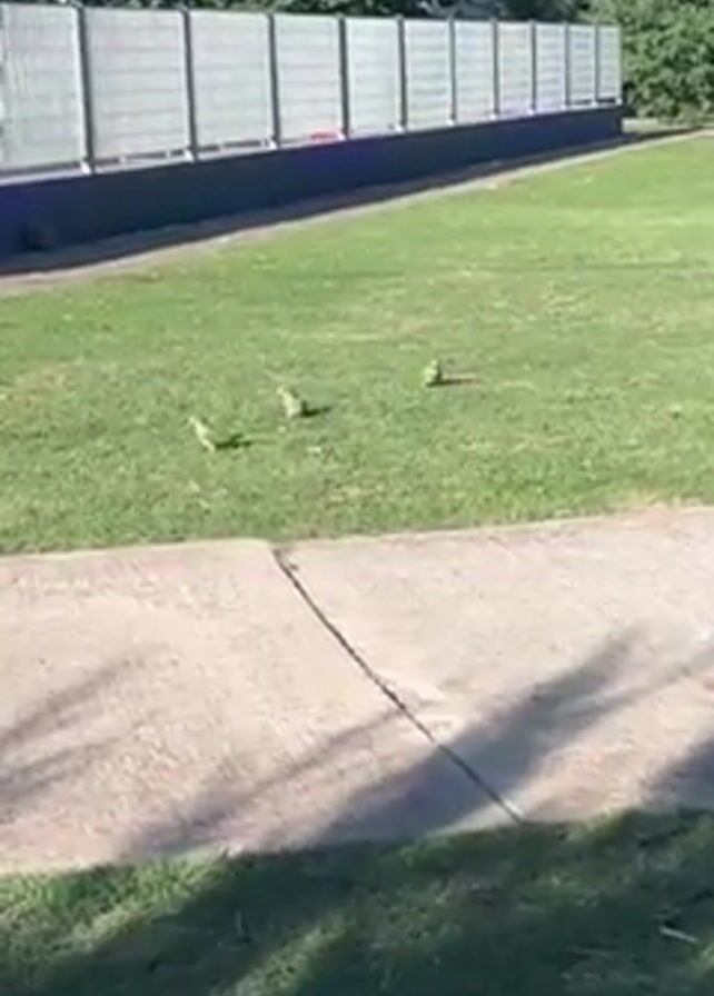 three green parrots standing on a grassy lawn next to a sidewalk. They appear to be foraging or resting. After a few seconds, the parrots take flight, flying towards a fence. The camera pans upward to show the fence, which surrounds a structure containing some objects, but their exact nature is unclear. The background includes green trees and a bright blue sky.