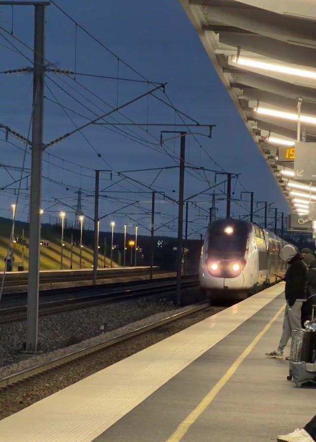 high-speed train approaching a train station platform at dusk