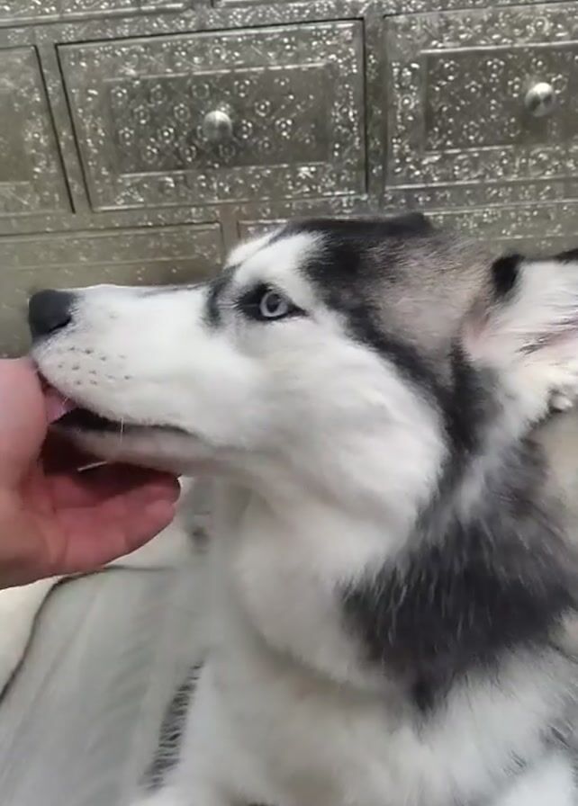 A close-up shot shows a person's hand gently petting the chin of a husky dog