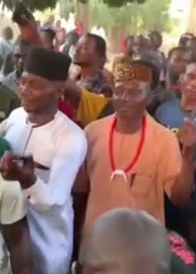 A crowd of predominantly Black men, some with graying hair, are gathered outdoors, possibly in a rural area with some trees visible. Most are looking in the same direction, and many are holding up smartphones. The man in the center of the frame is wearing an orange garment, a leopard-print hat, and a white beaded necklace. Several men are singing and appear excited, while others are looking on. Some are wearing t-shirts with various graphics or messages. A smartphone in a blue case is being held aloft, the screen visible. The atmosphere is celebratory, possibly at a funeral or memorial service, given a t-shirt visible with the text, "In Loving Memory of Late Pst. Godwin Shedurok."