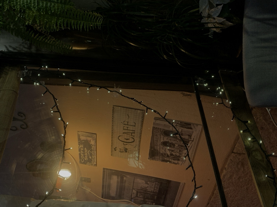 The scene depicts an interior space, likely a cafe or restaurant, located in Krakow, Poland, under artificial illumination. The focal point is a light brown-orange wall decorated with several rectangular signs and prints. A prominent string of small, warm white LED lights on a black wire diagonally spans the image. On the wall, from top to bottom: 1. A rectangular sign displays the text "COFFEE SHOP" above an illustration of a dog. 2. Below it, a larger rectangular sign features the word "CAFÉ" in a stylized font, accompanied by a vintage illustration of a person. 3. Further down, a rectangular print shows an architectural street scene with arched openings, one of which is partially labeled "SALFUS." An additional, darker print of a storefront is partially visible to the left of the "CAFÉ" sign. An exposed, lit incandescent bulb hangs in the upper-left corner, casting a warm glow. To the right of the wall, a dark vertical area contains a tall, dark green leafy plant, resembling a fern, positioned in a dark pot. Below it, a plant with pale or white leaves is partially visible. A dark horizontal beam spans the top edge of the frame, and a lighter wooden railing runs across the lower middle section. The backrest of a grey upholstered chair or bench is visible in the bottom right corner. No individuals or specific actions are discernible. The lighting conditions suggest an evening or nighttime setting.