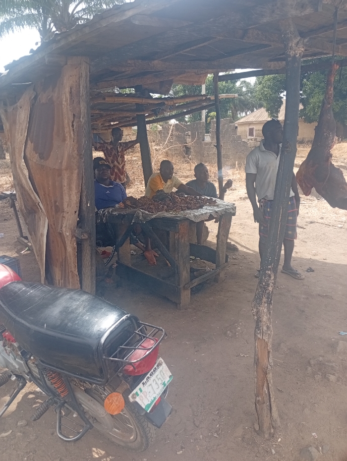 The image depicts a scene in a rural area of Assai Sabongida, Nigeria. The scene is set beneath a simple, wooden shelter, likely a makeshift stall or market stand. Four men are gathered around a table, seemingly engaged in conversation. One man is wearing a blue shirt and a red hat, another is wearing a yellow shirt, and the third wears a blue shirt. Two of the men are seated at the table, while the other two stand by the side. There is a motorcycle parked nearby, the license plate visible and reading "PP-7359," suggesting the men are waiting for a customer or are taking a break from their day. The setting is a dusty, dirt road with a small, unpaved area around the table. The scene is a typical example of rural life in Assai Sabongida, Nigeria, with a relaxed atmosphere of community and everyday interactions.