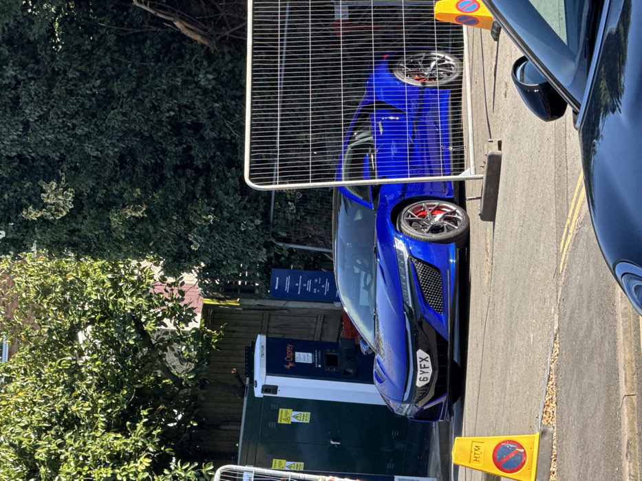 This image depicts an outdoor scene in Kenilworth, United Kingdom, on a bright, sunny day. The primary subject is a radiant blue Honda NSX (Acura NSX) sports car, bearing the UK license plate "6 YFX", parked angled slightly towards the left. The car features multi-spoke alloy wheels with prominent red brake calipers and a dark-colored roof. To the left of the car, an electric vehicle charging station is visible. This station consists of a large, dark green electrical cabinet with yellow warning labels, and a white "Osprey" branded charging unit with "Tritium" visible on its top and a "Welcome!" sign to its right. The entire charging station area and part of the blue car are partially enclosed by temporary metal construction barriers. One barrier stands prominently in the mid-right foreground, and another is partially visible on the left. In the lower foreground, the hood and a side mirror of a dark, likely black, vehicle are visible, suggesting the photograph was taken from within or immediately beside another car. Two yellow and orange traffic cones, marked with "HTM" and a "No Waiting" symbol, are positioned on the asphalt pavement in the lower-left and mid-right, respectively, near the barriers. The background consists of lush green trees and bushes, with a glimpse of a reddish-brown brick building behind the foliage on the far left. The ground is an asphalt surface, and yellow double lines, characteristic of UK road markings, are faintly visible on the pavement to the right of the blue car. No people are visible in the scene, and no active charging connection is apparent on the blue car.