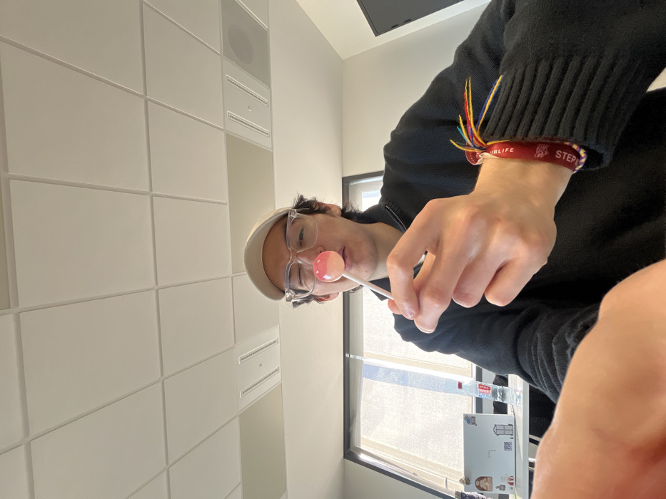 A single individual, appearing to be male, is depicted from the chest up in an indoor setting. The person, wearing a light beige baseball cap, clear-framed rectangular glasses, and a dark quarter-zip sweater, is winking with their right eye and puckering their lips while holding a pink and lighter pink/white spherical lollipop on a white stick near their nose with their right hand. A red fabric wristband with partially visible text "STEPS" and "STEP LIFE," adorned with multiple colorful strings, is worn on their left wrist. The background features a white desk on the left, where a silver-colored laptop with several small stickers on its lid is open, alongside a transparent plastic bottle of Mont Roucous mineral water, which indicates a French location. Behind the desk, a large window with horizontal white blinds allows daylight into the room. The upper portion of the image shows a white ceiling with visible acoustic panels and integrated ventilation/lighting fixtures. A dark door is partially visible on the far right. The specific location within the city of Roubaix, France, cannot be determined from the visual information provided.