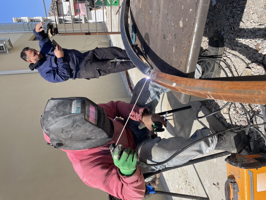 In Čanj, Montenegro, an outdoor scene depicts two men engaged in metal fabrication under a clear blue sky