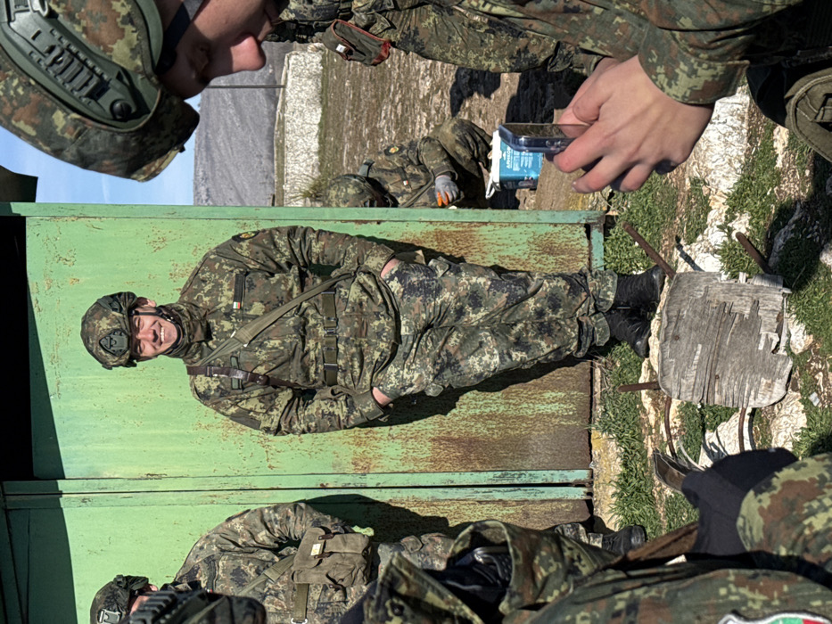 A group of soldiers in camouflage uniforms are visible, some wearing helmets. One soldier is smiling and leaning against a green metal wall. Another soldier is lying down, with a box of wipes next to him, and someone is holding a phone above him. The overall scene suggests a break or downtime during a military exercise or operation. There are also what appears to be a worn-out chair nearby.