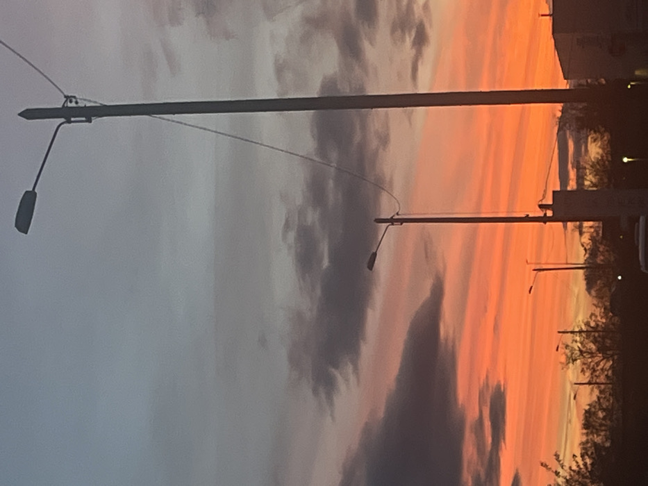 The image depicts an urban or semi-urban streetscape in Sélestat, France, at sunset or sunrise. The sky dominates the frame, exhibiting a gradient from a greyish-blue at the top to vibrant orange and red hues towards the horizon. Dark, textured clouds are scattered across the upper and middle portions of the sky, contrasting with the brighter colors below. In the foreground, a prominent, dark streetlight pole stands vertically on the right side, extending from the bottom to near the top of the frame. It features a single, curved light fixture projecting leftward and a pointed finial at its apex. Multiple dark cables or wires are attached to this pole, with one arcing diagonally downwards to the left. Further to the left and slightly behind the foreground pole, a second, thinner streetlight pole with its own light fixture is visible. Several additional dark, vertical poles or utility structures are discernible in the midground, silhouetted against the sky. A thick, rectangular utility structure is present to the left of the main foreground pole. Along the horizon line, dark silhouettes of leafless or sparsely leaved trees and bushes create an irregular line. To the far right, faint, dark outlines of low-rise buildings or industrial structures are present. At the very bottom edge of the frame, centrally located, the top portion of a dark vehicle, possibly a car or van, is partially visible. No individuals are discernible within the frame, and no specific actions or interactions are evident.