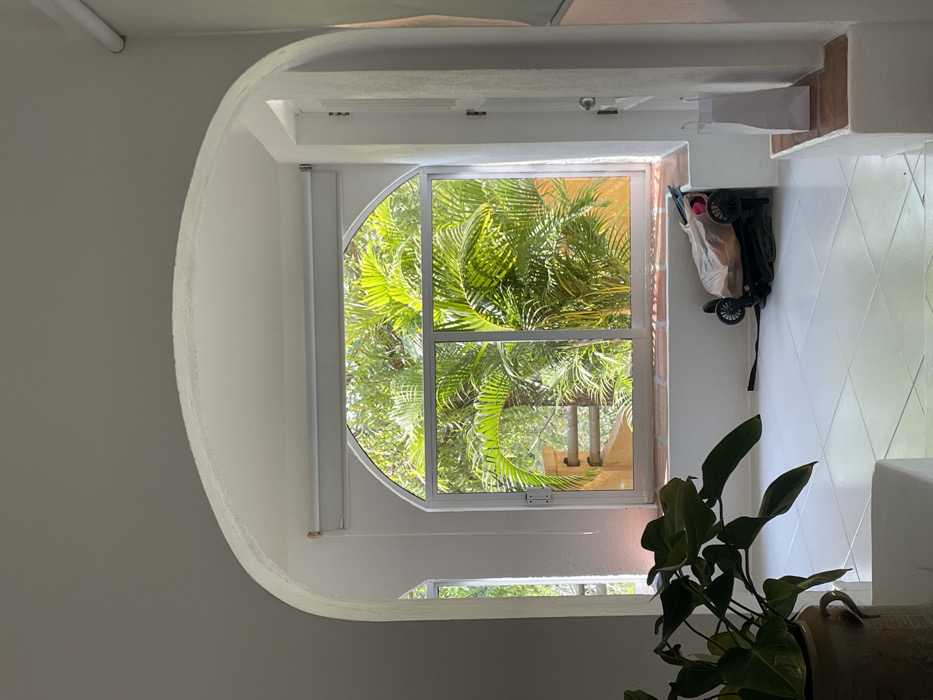A white arched window frames lush greenery outside, revealing palm trees and sunlight
