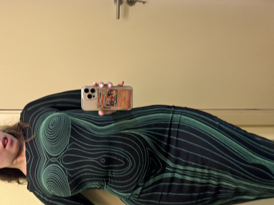 A person is partially depicted in a mirror selfie, showing light brown wavy hair and an open mouth with a partially extended tongue. The individual wears a form-fitting, long-sleeved dress featuring a dark blue/black base with bright green organic lines that visually contour the body. A light-colored iPhone, equipped with a clear case holding several Pokémon trading cards (including a prominent Charizard card), is held in the subject's right hand. The background consists of a plain, light beige or cream-colored wall or door surface to the right, on which a silver door handle with a set of keys is visible. The image contains no discernible landmarks or identifying features to specify a location within Sofia, Bulgaria.