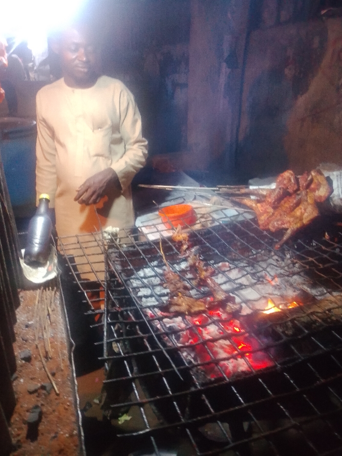 An evening scene in Lokoja, Nigeria, depicts a man engaged in grilling meat outdoors