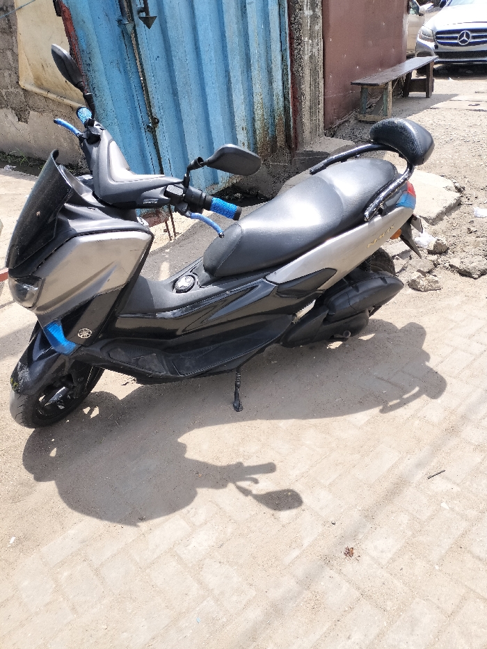 A silver and black Yamaha NMAX scooter, featuring blue handlebar grips and front fairing accents, is parked on an interlocking concrete paver surface. The scooter's side stand is deployed. Behind the vehicle, a light blue corrugated metal structure adjoins a reddish-brown wall. A silver Mercedes-Benz vehicle and a wooden bench are partially visible in the distant background. The ground exhibits dirt and loose debris. The scene is illuminated by direct sunlight, casting distinct shadows. No individuals or active interactions are present. Location: Alaiyabiagba, Nigeria.