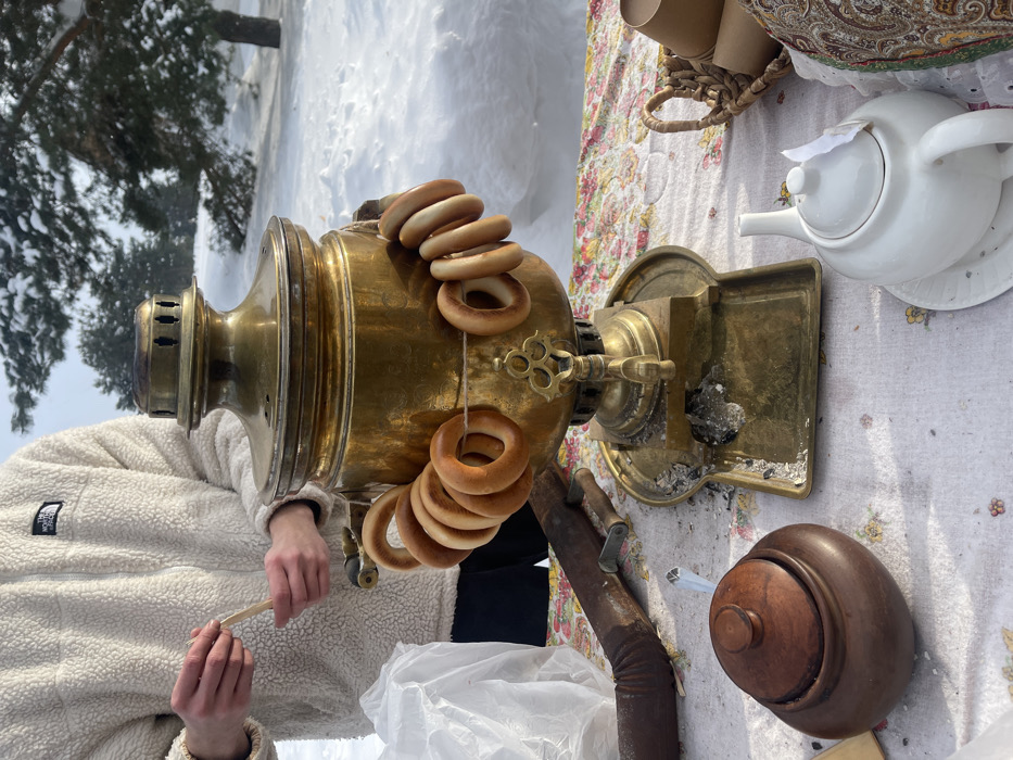 An outdoor scene in Березницы, Russia, depicts a table set against a snow-covered landscape with pine trees. Centrally positioned on a white tablecloth with a pink and green floral pattern is a large, brass-toned samovar, around which a string of light brown, ring-shaped bread products (e.g., *bubliki*) is draped. Ash is visible in the samovar's base tray. To the left, a person, partially visible from the torso down, wearing a beige fleece jacket with a "THE NORTH FACE" logo, holds a small light wooden stick or utensil. A rusted, dark brown metal pipe with a handle rests on the table to the left of the samovar, near a white plastic bag. A dark brown ceramic pot with a lid is also on the table to the left. To the right, a white ceramic teapot with a small white tag sits on a saucer, next to a woven basket containing several brown paper cups. A patterned fabric is visible on the far right of the table.