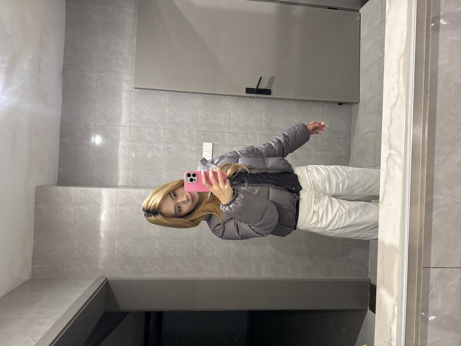 The image displays an indoor mirror selfie taken by a young East Asian female, located within a modern tiled room in Nan'an District, China. The subject, positioned centrally and facing the camera's reflection, has long blonde hair with visible dark roots. She is wearing a grey cropped puffer jacket over a dark cable-knit top and white wide-leg trousers. She holds a pink-cased smartphone in her right hand, pointing it towards the mirror to capture the photograph, with her gaze directed towards the phone screen. The room's walls are clad in light grey rectangular tiles. To the right of the reflection, a plain grey door with a black horizontal handle is visible. To the left, a dark, recessed opening or doorway is apparent. A white rectangular electrical fitting, possibly an outlet or switch, is present on the tiled wall behind the subject's reflection. Below the mirror, a light-colored, marble-patterned countertop extends across the frame. The floor is tiled in a darker grey, partially visible at the bottom. Overhead lighting sources are reflected on the glossy tiled surfaces.