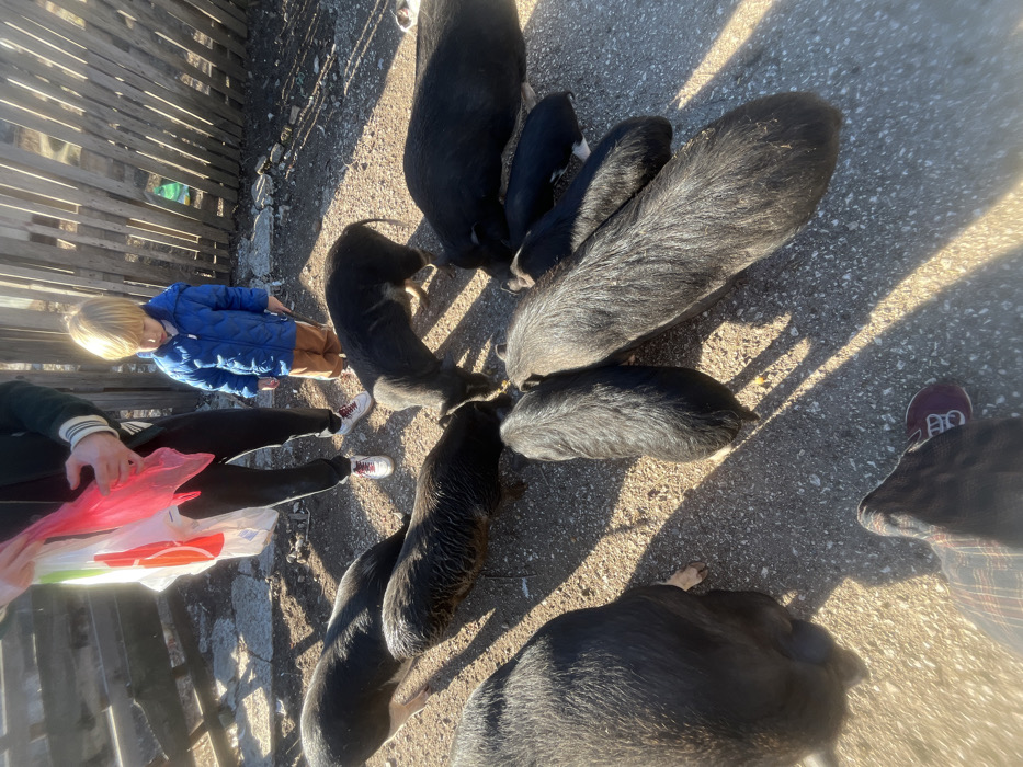 - "An outdoor scene in Škaljari, Montenegro, depicts an adult and a child interacting with approximately ten black pigs of various sizes on an unpaved, dusty ground under direct sunlight" by FM-UXihg1, licensed under CC BY 4.0