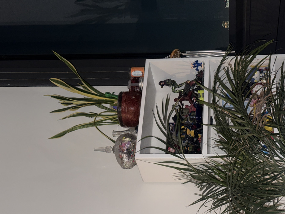 white bookshelf with various items on display. The shelf contains a variety of action figures and other collectibles. To the left of the shelf is a plant in a brown pot with long, striped leaves. Below the plant is a glass container with a decorative top. To the right of the bookshelf is a large, leafy plant with many thin fronds. The background shows a dark, reflective surface, possibly a window.