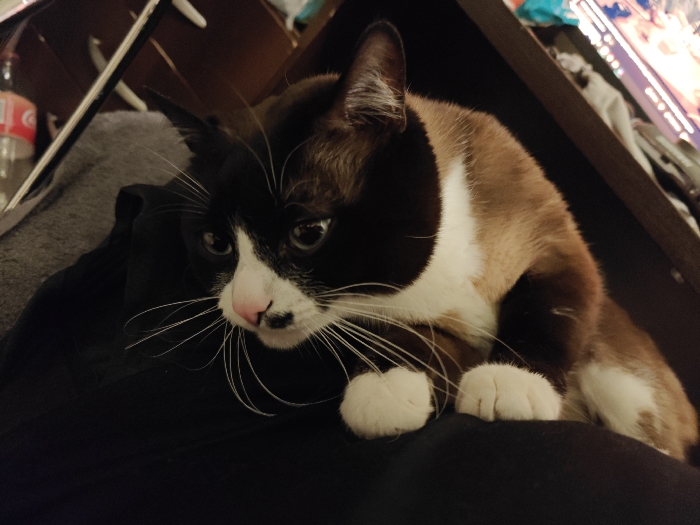 - "A tan, black, and white cat with a pink nose rests on a person's lap" by FM-eMutn2, licensed under CC BY 4.0