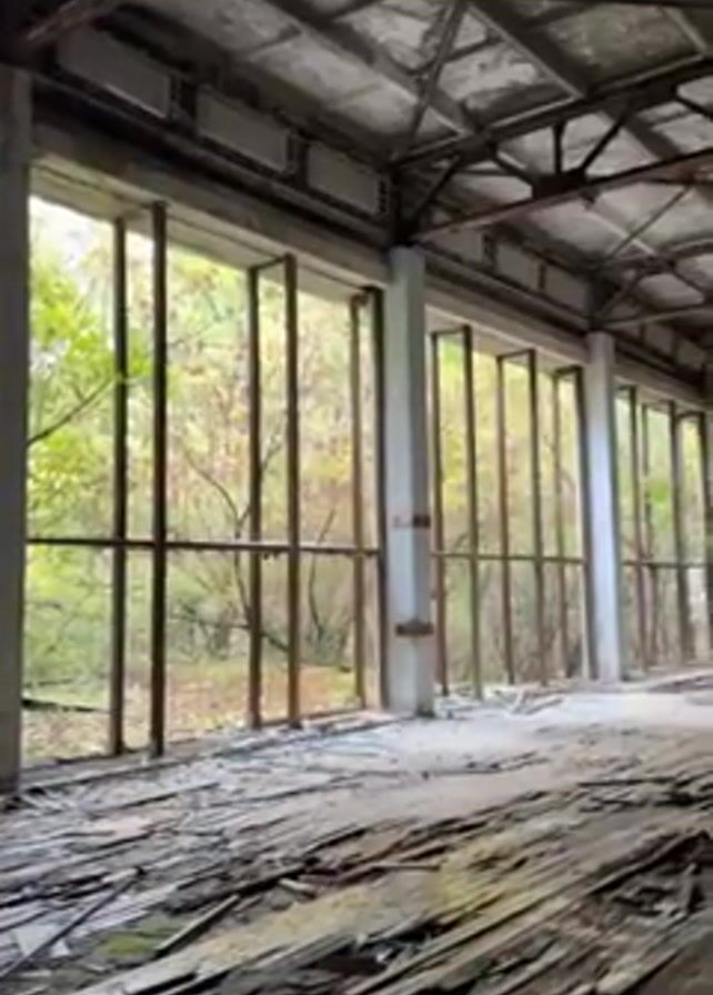 The camera pans from a low angle to reveal an abandoned indoor space, resembling a gymnasium or a large hall. The floor is made of wooden planks, which are severely decayed and warped, showing signs of significant water damage and rot. A row of tall, rectangular windows runs along one side of the hall, offering a view of trees and foliage outside, suggesting an overgrown natural environment. The walls are concrete and appear stained and weathered, with paint peeling off in places. A basketball hoop is mounted on one of the walls, further indicating the space's former use as a gymnasium. The ceiling has a complex structure of metal beams and concrete panels, all showing signs of age and disrepair. The overall atmosphere is one of neglect and abandonment. There are no people visible in the scene.